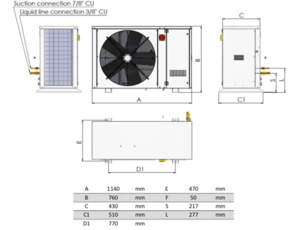 The SILENT Area SAPTXSs 5 MP is condensing unit intended for cold room systems such as refrigerated warehouses, low-temperature depositories, refrigeration cabinets, and liquid coolers, among other installations. With a cooling capacity of 4.5 kW at -30/32 ºC R449A and air flow rate of 5,848 m3/h, its thermodynamic properties and energetic efficiency make it an ideal condensing unit apt for medium-scale commercial and industrial applications. Designed and manufactured by, Area Cooling in the EU with a commitment to uphold the highest quality standards. The SILENT Area SAPTXSs 5 MP is 380-415 volt 50 hertz 3-phase power supplied and is operational with three different types of HFC refrigerant blends, with the aim of providing users with maximum versatility (R404A, R448A and R449A). In comparison with loud conventional condensing units, the SILENT condensing units manufactured by Area Cooling feature diminished sound levels due to the acoustically insulated housing of the compressor compartment. With noise levels at only 41 dB, the  SILENT Area SAPTXSs 5 MP is one of the most silent units on the market.